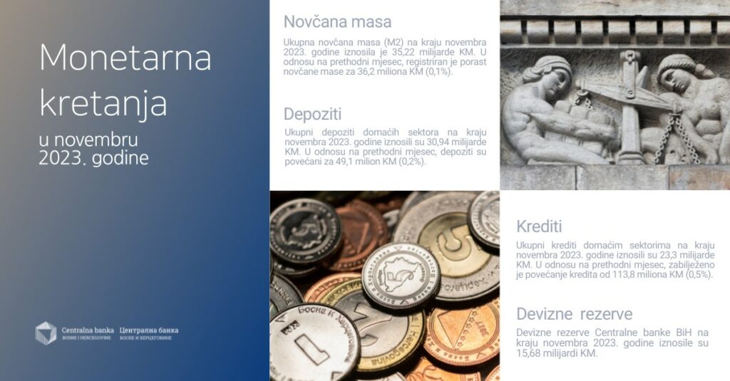 Centralna banka Bosne i Hercegovine objavila je monetarna kretanja u novembru 2023. godine.