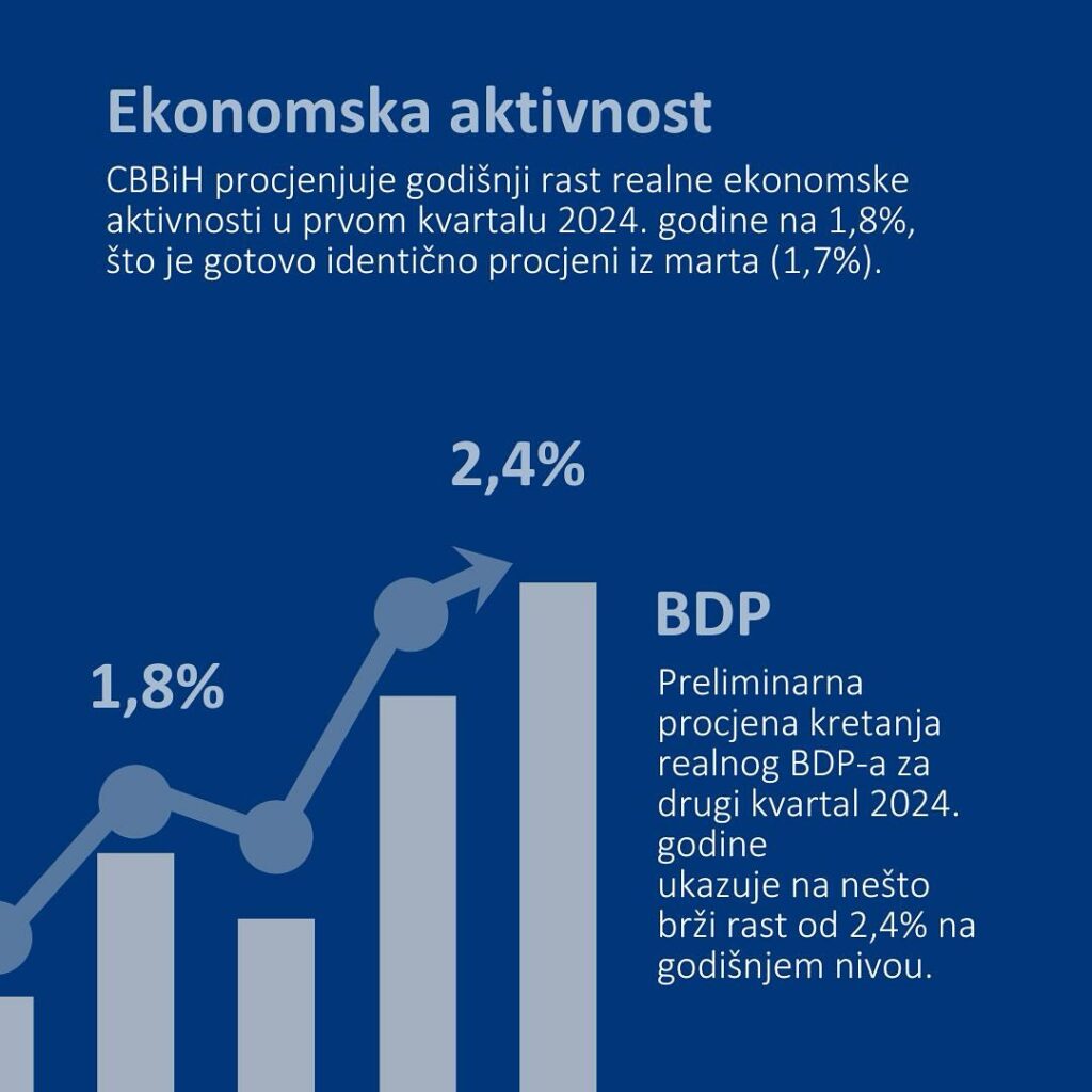 Imajući u vidu kako industrijska proizvodnja bilježi nešto slabiji pad aktivnosti, a izvoz blagi rast na godišnjem nivou u aprilu 2024. godine, naša prva preliminarna procjena je da bi ekonomska aktivnost mogla biti nešto jača u drugom kvartalu, oko 2,4%. Posljedično, naša preliminarna procjena intenziteta rasta realnog BDP-a iznosi 2,1% za prvo polugodište 2024. godine, poručili su u svojoj brzoj procjeni iz Centralne banke BiH.