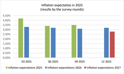 Rezultati ankete pokazuju da se očekuje inflacija za 2026. godinu od 3,20%, što predstavlja povećanje od 0,10 postotnih bodova u odnosu na septembarski krug anketa. Istovremeno, očekuje se postepena stabilizacija inflacijskih kretanja u 2027. godini, s očekivanom inflacijom od 2,80%.