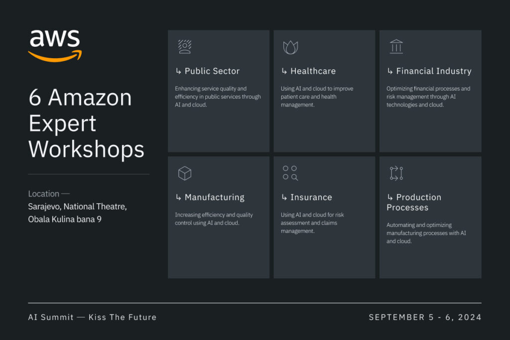 Jedan od ključnih segmenata ovog događaja biće ekskluzivne radionice koje će voditi stručnjaci iz Amazon Web Services (AWS). Stručnjaci iz AWS-a donose bogato iskustvo i najnovije uvide u AI alate i tehnike koje transformišu globalno poslovanje.