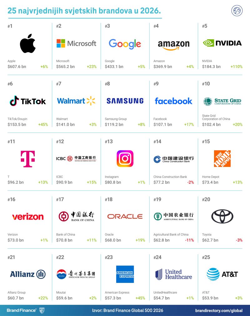Američki tehnološki brendovi nastavljaju dominirati među prvih 10 na listi Brand Finance Global 500 u 2026. godini, potvrđujući prednost razmjera i globalni doseg najvećih svjetskih digitalnih ekosistema.