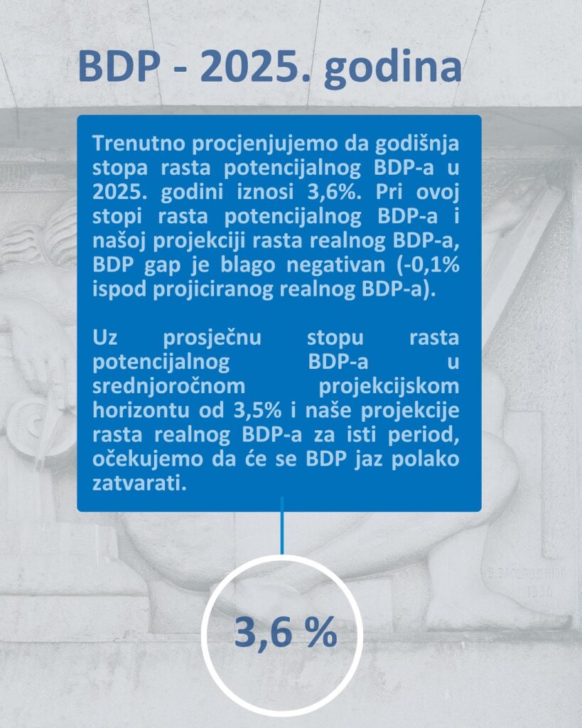 Prema našim prvim zvaničnim procjenama, rast potencijalnog BDP-a nije značajno ubrzao skoro dvije decenije. Prosječna historijska stopa rasta potencijalnog BDP-a za period 2008 – 2024. godina procijenjena je na 2,4%. Trenutno procjenjujemo da godišnja stopa rasta potencijalnog BDP-a u 2025. godini iznosi 3,6%. Pri ovoj stopi rasta potencijalnog BDP-a i našoj projekciji rasta realnog BDP-a, BDP gap je blago negativan (-0,1% ispod projiciranog realnog BDP-a). Uz prosječnu stopu rasta potencijalnog BDP-a u srednjoročnom projekcijskom horizontu od 3,5% i naše projekcije rasta realnog BDP-a za isti period, očekujemo da će se BDP jaz polako zatvarati.