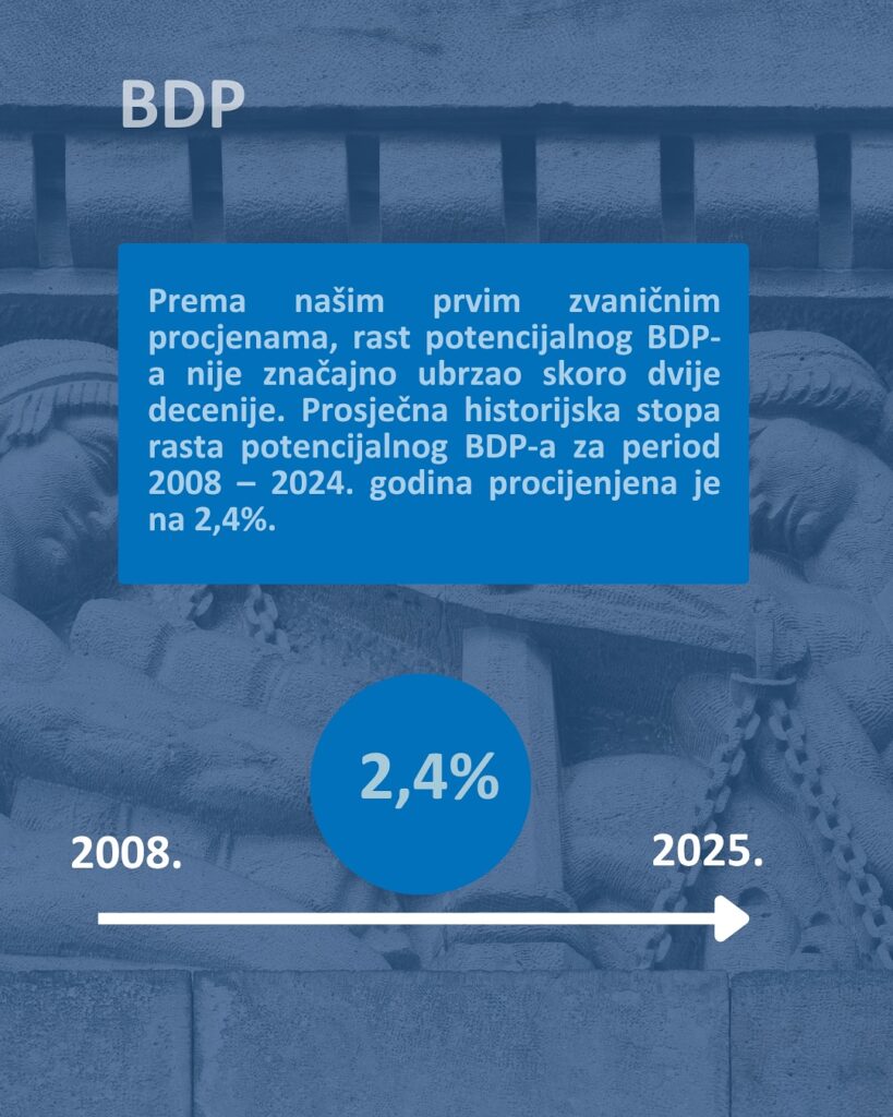 Trenutno procijenjena stopa rasta potencijalnog BDP-a nije dovoljna za dugoročno održiv rast i snažniju realnu konvergenciju ka EU. Strukturne reforme na tržištu rada, uključujući i one koje podstiču jače angažovanje neaktivnog radno sposobnog stanovništva, u kombinaciji s mjerama za povećanje produktivnosti, imaju značajan potencijal za podizanje dugoročnog rasta potencijalnog BDP-a u BiH.