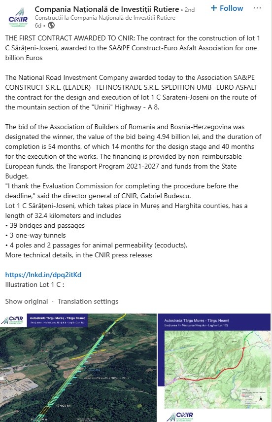 Nacionalna kompanija za ulaganje u puteve Rumunije (CNIR) dodijelila je rumunsko-bosanskohercegovačkom konzorciju u sastavu SA&PE CONSTRUCT S.R.L., TEHNOSTRADE S.R.L. SPEDITION UMB i Euro-Asfalt ugovor za projektiranje i izvođenje Lota 1 C Sărăteni-Joseni na trasi planinskog dijela autoputa Unirii – A8.