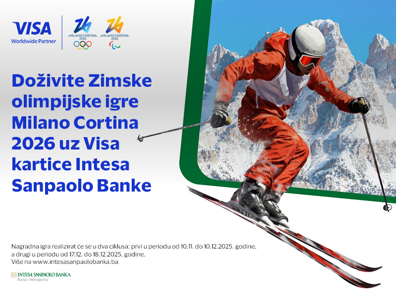Zahvaljujući kompaniji Visa, koja je zvanični sponzor Zimskih olimpijskih igara Milano Cortina 2026., Intesa Sanpaolo Banka organizuje Nagradnu igru za sve nove i postojeće klijente Banke s područja Federacije Bosne i Hercegovine.