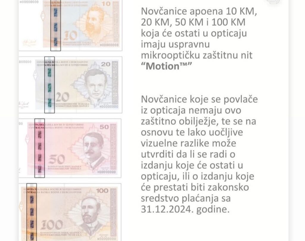 Centralna banka Bosne i Hercegovine (CBBiH) podsjetila je na rokove u postupku zamjene novčanica konvertibilne marke apoena 10 KM, 20 KM, 50 KM i 100 KM puštenih u opticaj u periodu od 1998. do 2009. godine, koje su povučene iz opticaja i prestale biti zakonsko sredstvo plaćanja 31. decembra 2024. godine.