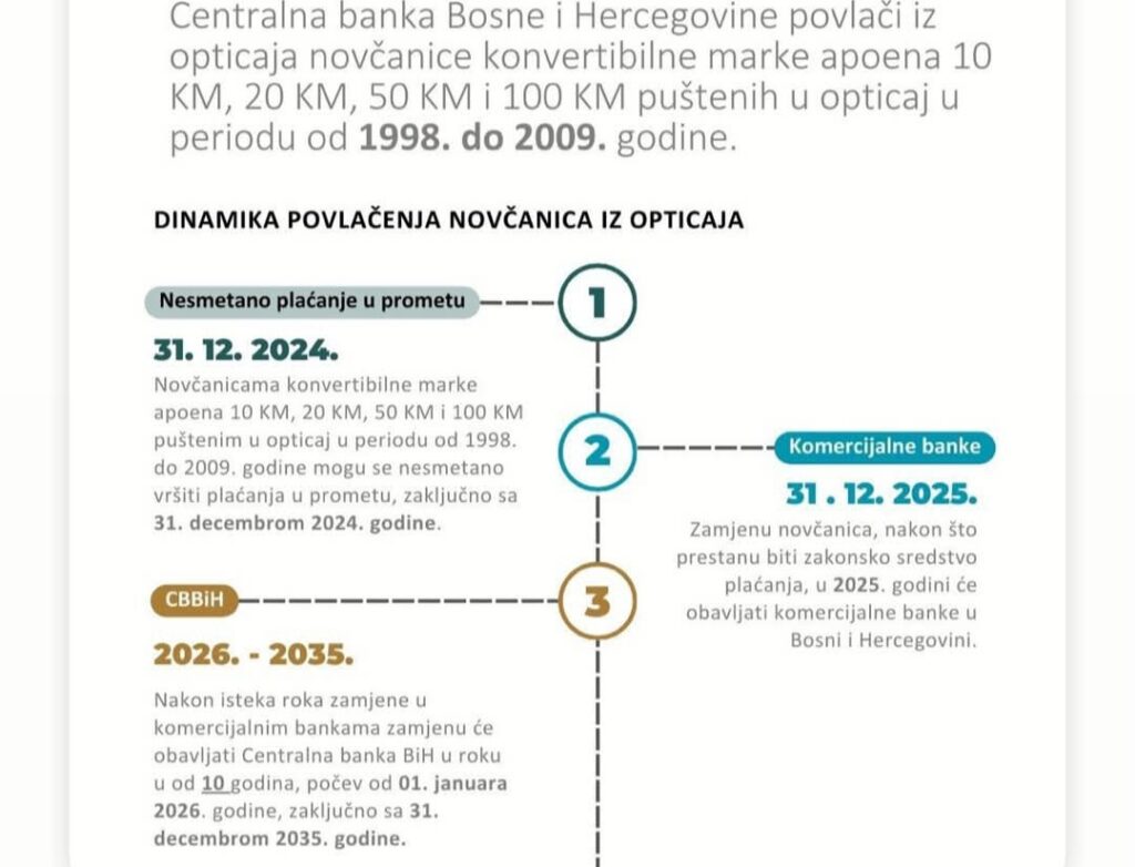 Centralna banka Bosne i Hercegovine (CBBiH) podsjetila je na rokove u postupku zamjene novčanica konvertibilne marke apoena 10 KM, 20 KM, 50 KM i 100 KM puštenih u opticaj u periodu od 1998. do 2009. godine, koje su povučene iz opticaja i prestale biti zakonsko sredstvo plaćanja 31. decembra 2024. godine.