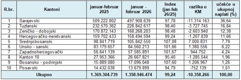 Porezna uprava Federacije Bosne i Hercegovine objavila je da su porezni obveznici Federacije BiH u periodu januar-februar 2026. godine uplatili 1.358.946.474 KM javnih prihoda.