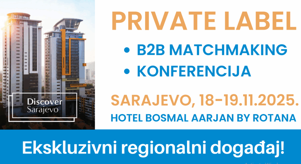 Vanjskotrgovinska/Spoljnotrgovinska komora Bosne i Hercegovine obavještava članice i zainteresovane kompanije da će se PRIVATE LABEL B2B Matchmaking & Konferencija održati 18. i 19. novembra 2025. godine u Sarajevu, u hotelu Arjaan Rotana Bosmal.