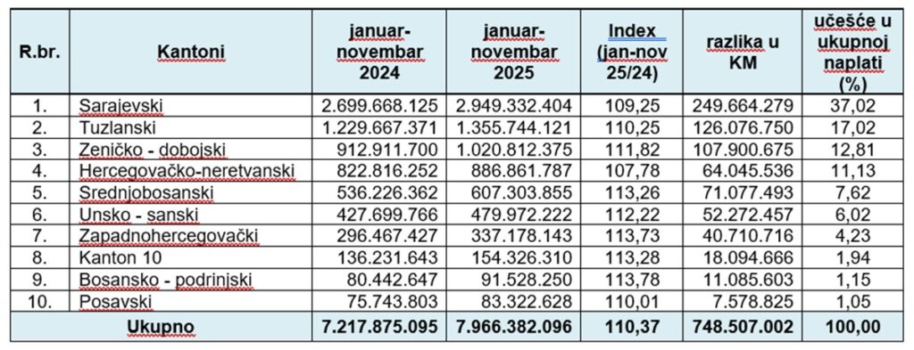 Porezna uprava Federacije BiH obavještava javnost da su porezni obveznici Federacije BiH u periodu januar-novembar 2025. godine uplatili 7.966.382.096 KM javnih prihoda, što je u odnosu na isti period 2024. godine više za 748.507.002 KM, ili za 10,37%.