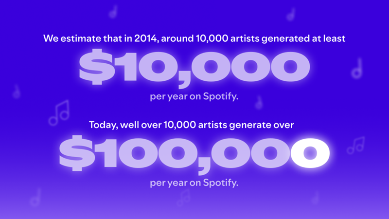 Prema podacima koje je objavio Spotify, više od 10.000 muzičara zarađuje preko 100.000 dolara godišnje samo putem njihovog streaming servisa. Među njima, 1.250 izvođača premašilo je milion dolara godišnje zarade, dok je 60 muzičara zaradilo više od 10 miliona dolara u jednoj godini.